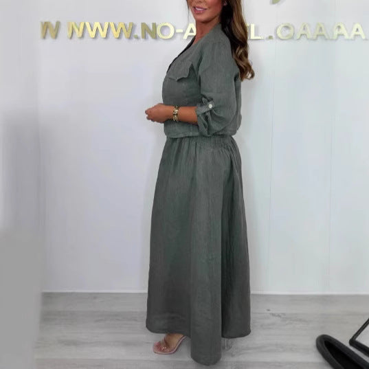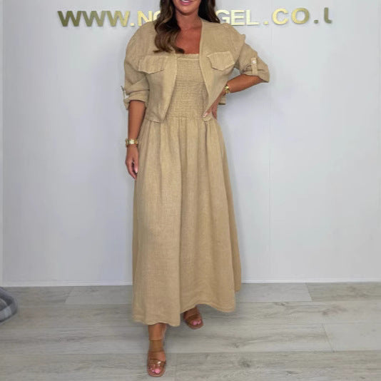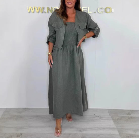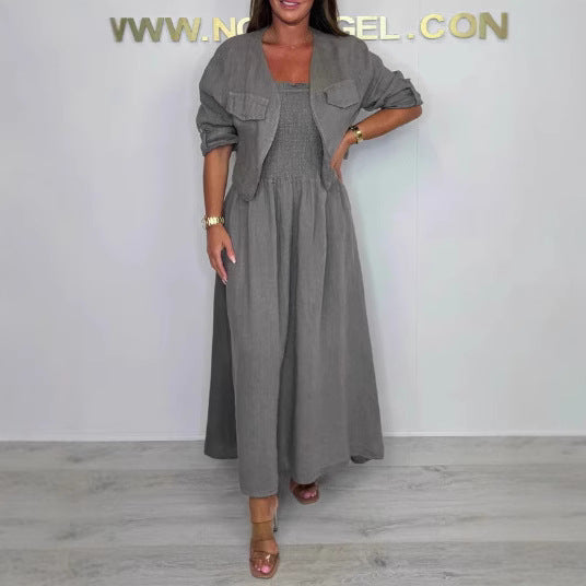 Make a bold statement with our Short Cardigan and Suspender Dress Set. This outfit is inspired by "European and American" street fashion, designed for the woman who loves to look trendy and effortless. It’s the perfect "Street Hipster" look that combines a sleek, long dress with a cropped top layer. Whether you are walking through the city or meeting friends for brunch, this two-piece set gives you an instant, high-fashion silhouette.
